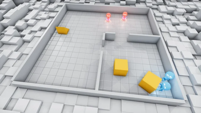 A la AI roja la recompensaban cuando encontraba en su campo de visión un personaje azul. A la AI azul la castigaba cuando era vista por un monigote rojo. Al cabo de millones de partidas, las inteligencias comenzaron a tener estrategias de juego claras que se pueden observar en este vídeo: